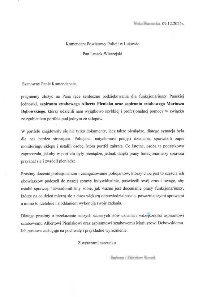 W liście przesłanym do Komendanta Powiatowego Policji w Łukowie poszkodowany wraz z żoną wyrazili słowa uznania dla zaangażowania i profesjonalizmu funkcjonariuszy. Kolejny raz łukowscy dzielnicowi pokazali, że dewiza Pomagamy i chronimy znajduje odzwierciedlenie w codziennej służbie.