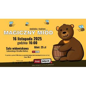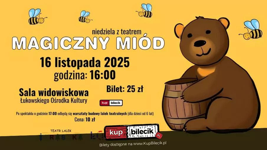 bilety: Łukowski Ośrodek Kultury zaprasza na kolejną Niedzielę z teatrem. W ramach wydarzenia odbędzie się spektakl teatralny pt. "Magiczny miód" w wykonaniu Teatru Lalek Igraszka oraz warsztaty budowy lalki teatralnej. Na przedstawienie zapraszamy w niedzielę 16 listopada 2025r. o godz. 16:00 do Sali Widowiskowej Łukowskiego Ośrodka Kultury. Po spektaklu o godz. 17:00 odbędą się warsztaty budowy lalki teatralnej. To idealna propozycja na niedzielne popołudnie dla całej rodziny. Zabierzcie dzieci w teatralną podróż do świata wyobraźni i magii! Spektakl teatralny "Magiczny miód" opowiada historię niedźwiadka Maciusia, który pewnego dnia dowiaduje się, że jego mama jest chora. Jedynym lekarstwem jest magiczny miód. Niedźwiadek wyrusza więc w poszukiwaniu miodu w daleką podróż. Tak trafia do tajemniczego lasu. W wyprawie towarzyszy mu przyjaciel, zabawny królik Kleofas. Dwaj mali bohaterowie muszą przechytrzyć podstępnego węża Sobiesława, a także przekonać królową pszczół, by podarowała im beczułkę magicznego miodu. Przedstawienie bawi dzieci, ale także uczy. "Magiczny miód" - Teatr Igraszka artyści: Teatr IgraszkaSpektakl teatralny "Magiczny miód" opowiada historię niedźwiadka Maciusia, który pewnego dnia dowiaduje się, że jego mama jest chora. Jedynym lekarstwem jest magiczny miód. Niedźwiadek wyrusza więc w poszukiwaniu miodu w daleką podróż. Tak trafia do tajemniczego lasu. W wyprawie towarzyszy mu przyjaciel, zabawny królik Kleofas. Dwaj mali bohaterowie muszą przechytrzyć podstępnego węża Sobiesława, a także przekonać królową pszczół, by podarowała im beczułkę magicznego miodu. Przedstawienie bawi dzieci, ale także uczy. Bilety do nabycia na: KupBilecik.pl |